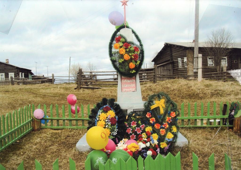 Евгений Егорович рассказывал: «Я тогда работал шофёром и в разъездах по республике видел, как ставились обелиски в населенных пунктах. Решил, что в нашей деревне он тоже должен быть. Мы обговорили это на сельском сходе. Это был 1969 год. Дети и взрослые собирали камни с полей, подвозили к месту на транспорте. Сделали опалубку, сами приготовили арматуру. Совхоз дал 800 кг цемента. Вначале имена погибших писались на простом листочке. Со списком обратились в Сыктывкарский механический завод, чтобы отлить имена на латунь. Нужны были 672 рубля за работу. Обратился в партком. С завода получили письмо с извинениями, обещали сделать работу бесплатно. Выгравированный лист из города привез директор совхоза «Помоздинский» Беляев. Письмо с благодарностью от имени односельчан послали снова в партком завода. Заметка с благодарностью выходила в газете «Красное знамя». Обелиск торжественно открыли 12 июля 1969 года. Три раза залпом выстрелили из ружья, был митинг».